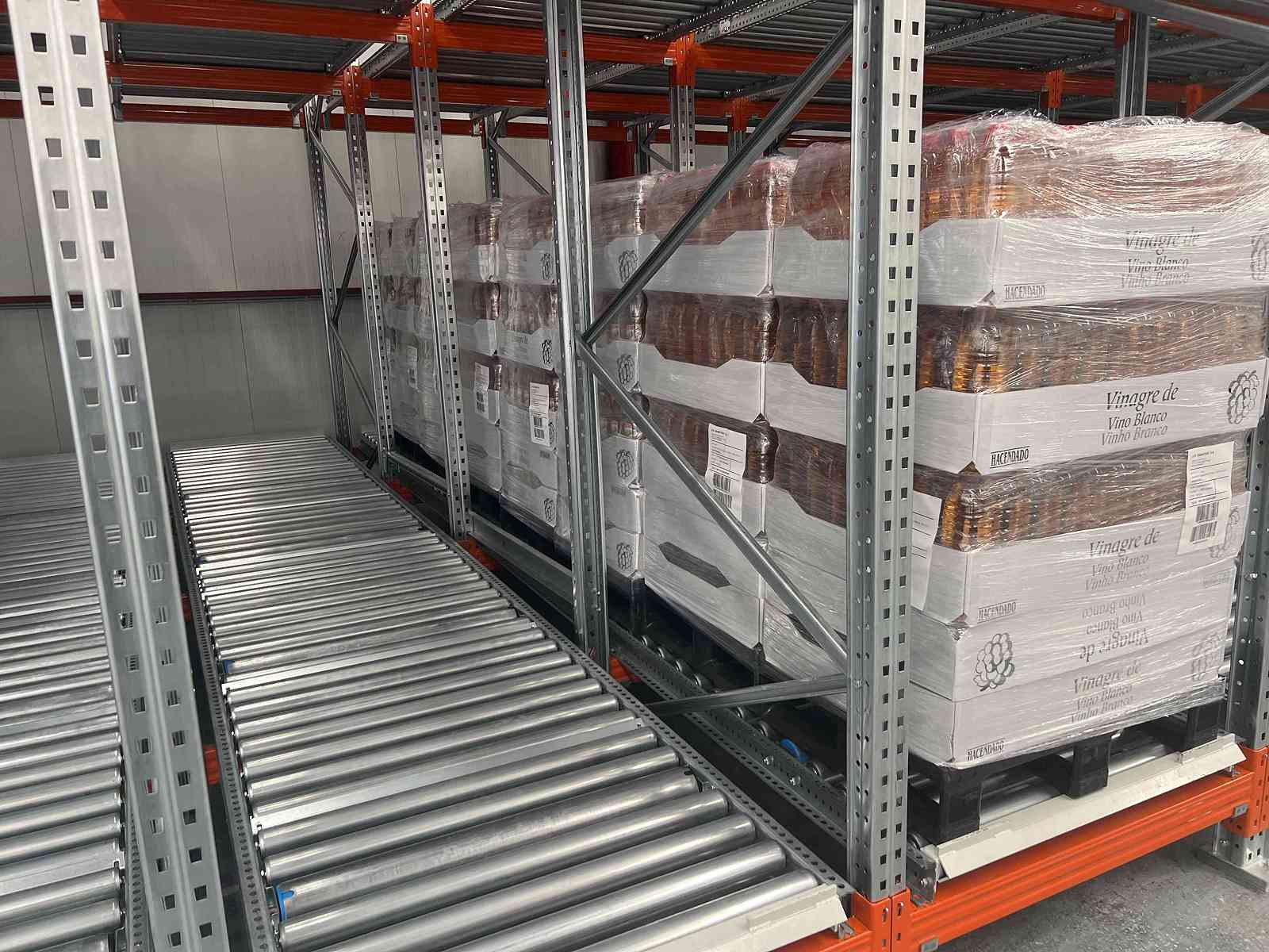 Esto supone un ahorro de costes energéticos importante. La fuerza de gravedad hace que se desplacen los palets por la estantería hasta colocarse en su posición final para su extracción.