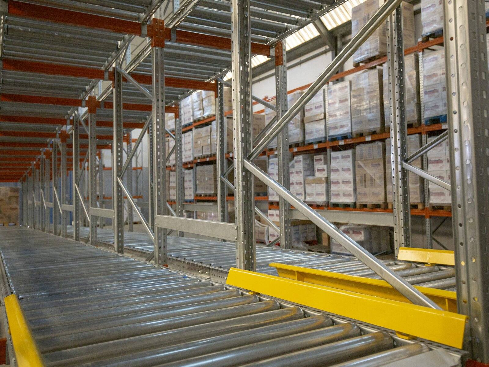 Este es el sistema más común de almacenamiento dinámico. Como ya comentamos en el punto anterior, los productos se deslizan solos por gravedad cuando el anterior es extraído por la zona de descarga. Con esto se consigue una óptima rotación de los productos y se reducen los movimientos de las carretillas que no tienen que introducirse en la estructura para manipular los palets.
