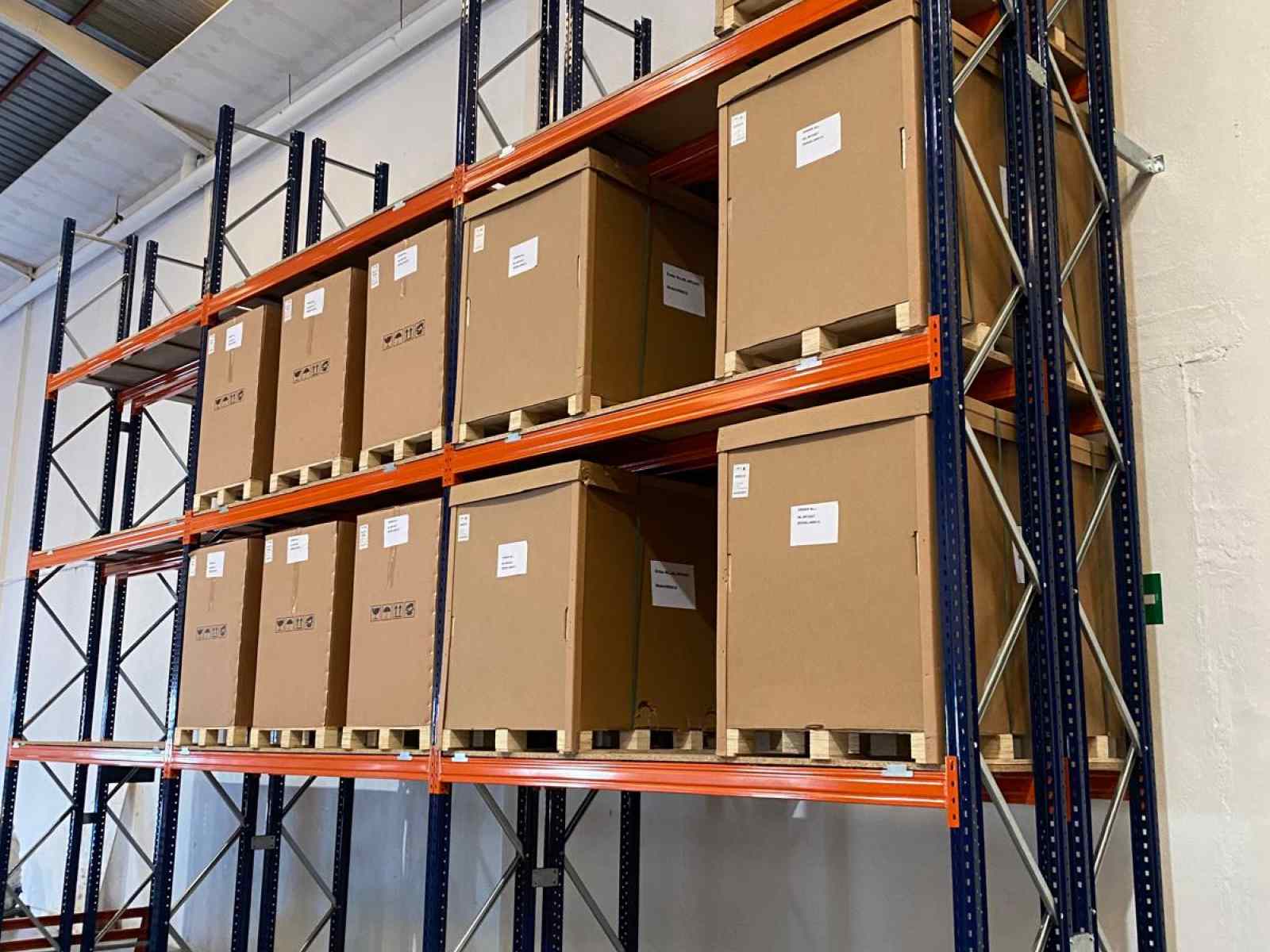 1 estantería con acceso doble compuesta por 3 módulos de 2.700mm de largo, 1.300mm de fondo y una altura total de 6.000mm, en este caso se ha optado por una distribución de 3 niveles más suelo.