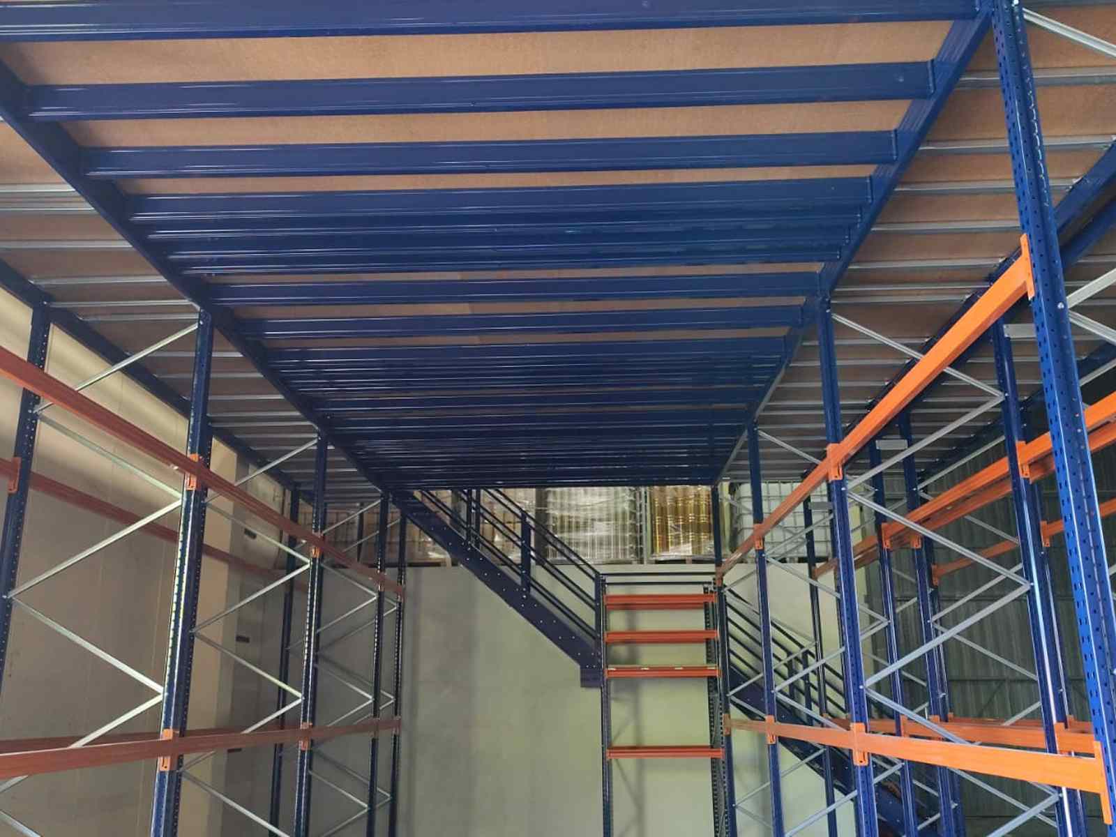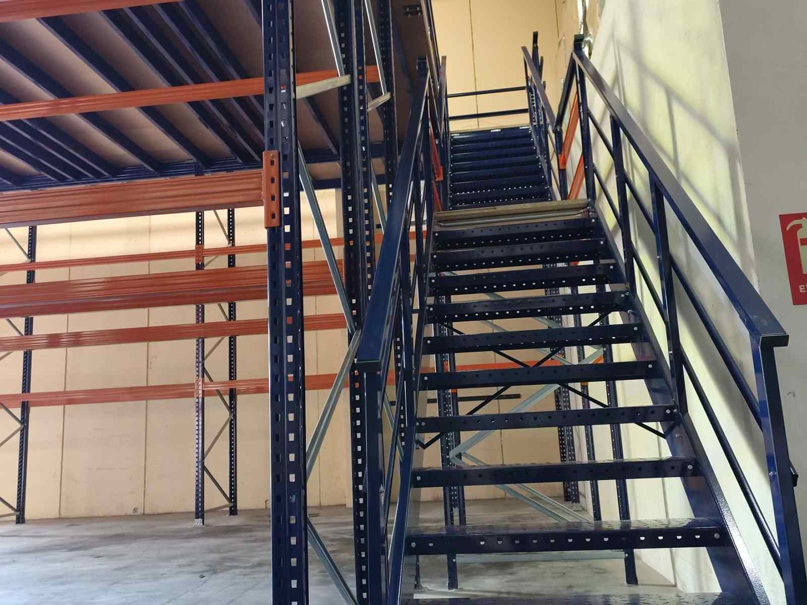 La entreplanta instalada duplica el espacio de almacenamiento en altura del almacén, alcanzando una altura total de 4’2 metros. Cuenta con dos escaleras de acceso, con barandilla y el suelo de tablero aglomerado. La parte inferior de la entreplanta está compuesta por 2 estanterías de paletización convencional de diferentes medidas: