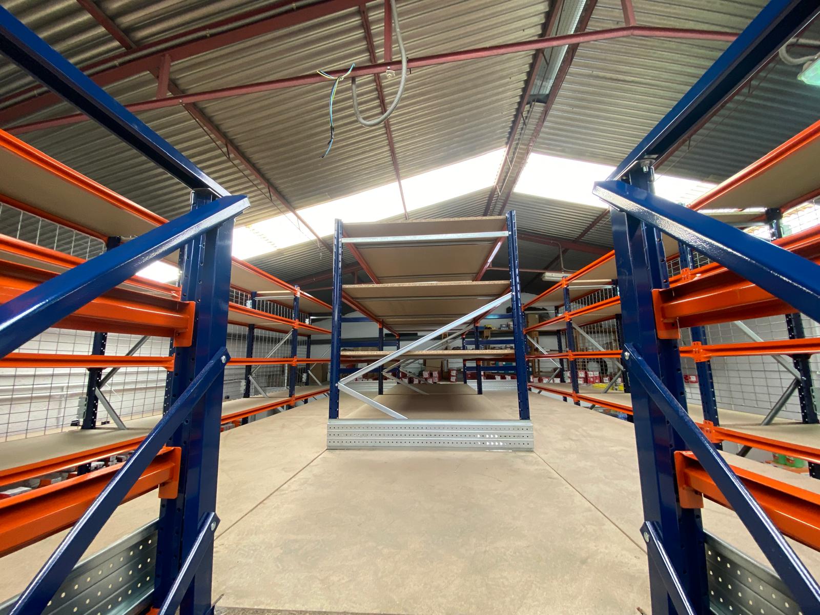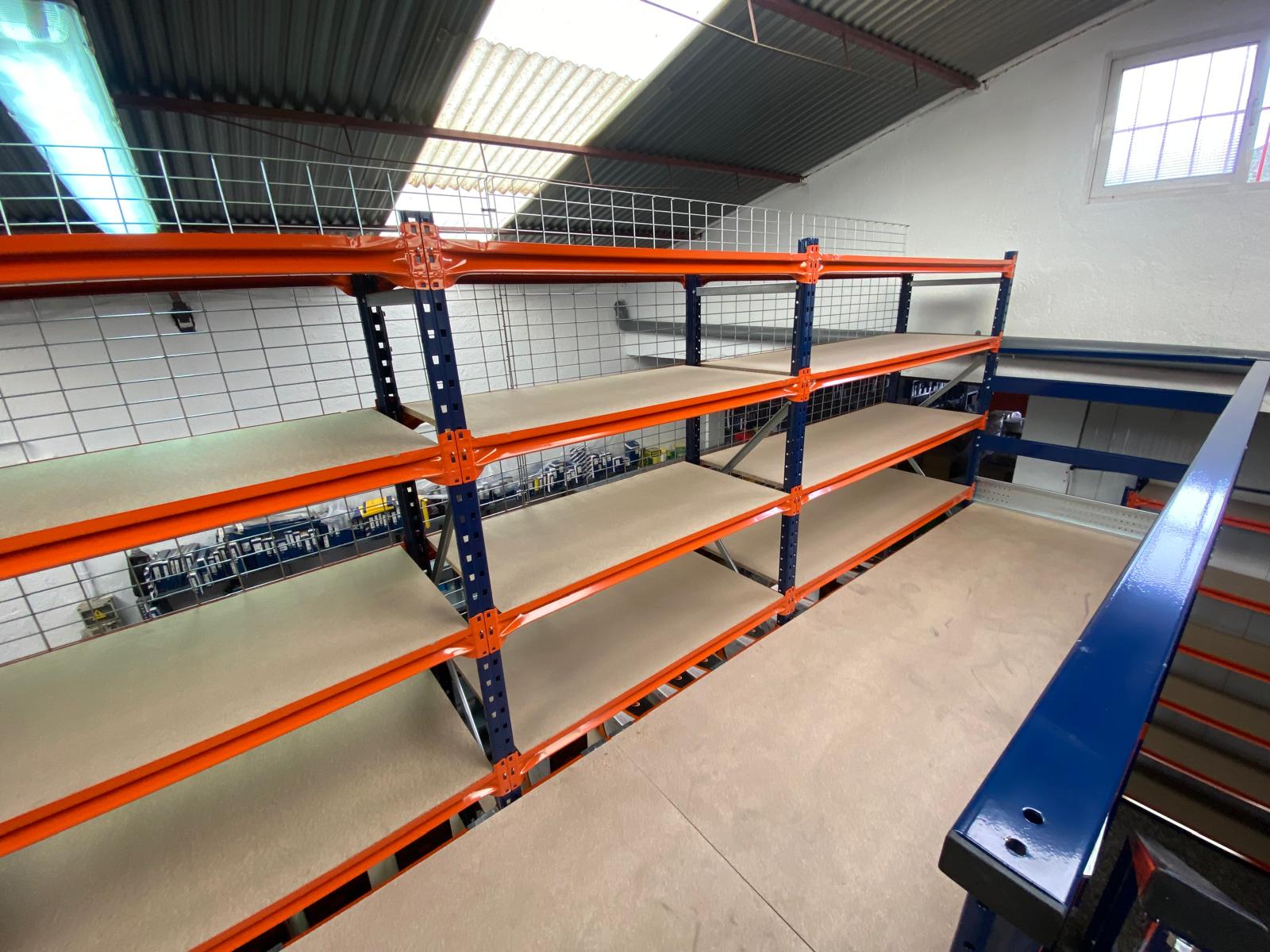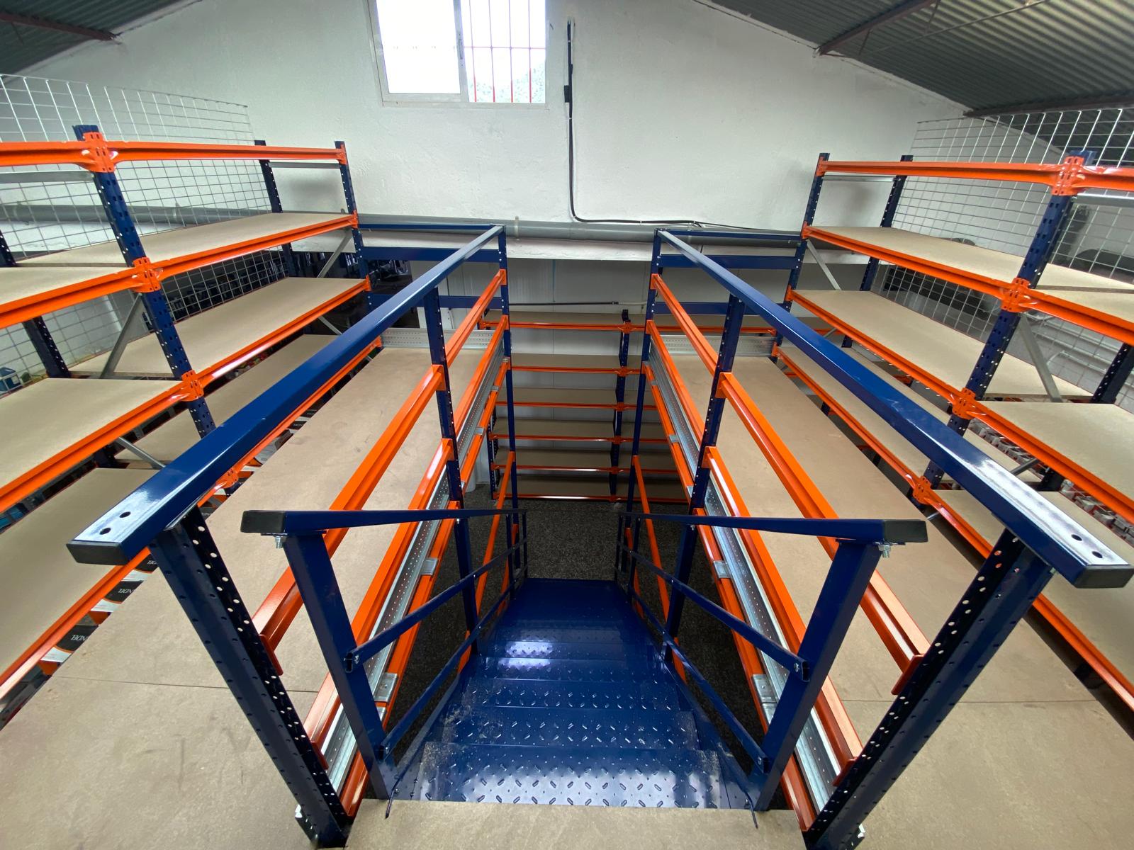 Se ha instalado una entreplanta que alcanza una altura total de 4 metros. Cuenta con una escalera de acceso, el suelo de tablero aglomerado, además de malla anticaída que se utiliza para evitar que los objetos almacenados en la planta alta caigan accidentalmente, mejorando así la seguridad. La entreplanta está compuesta por 3 tipos de estanterías diferentes: