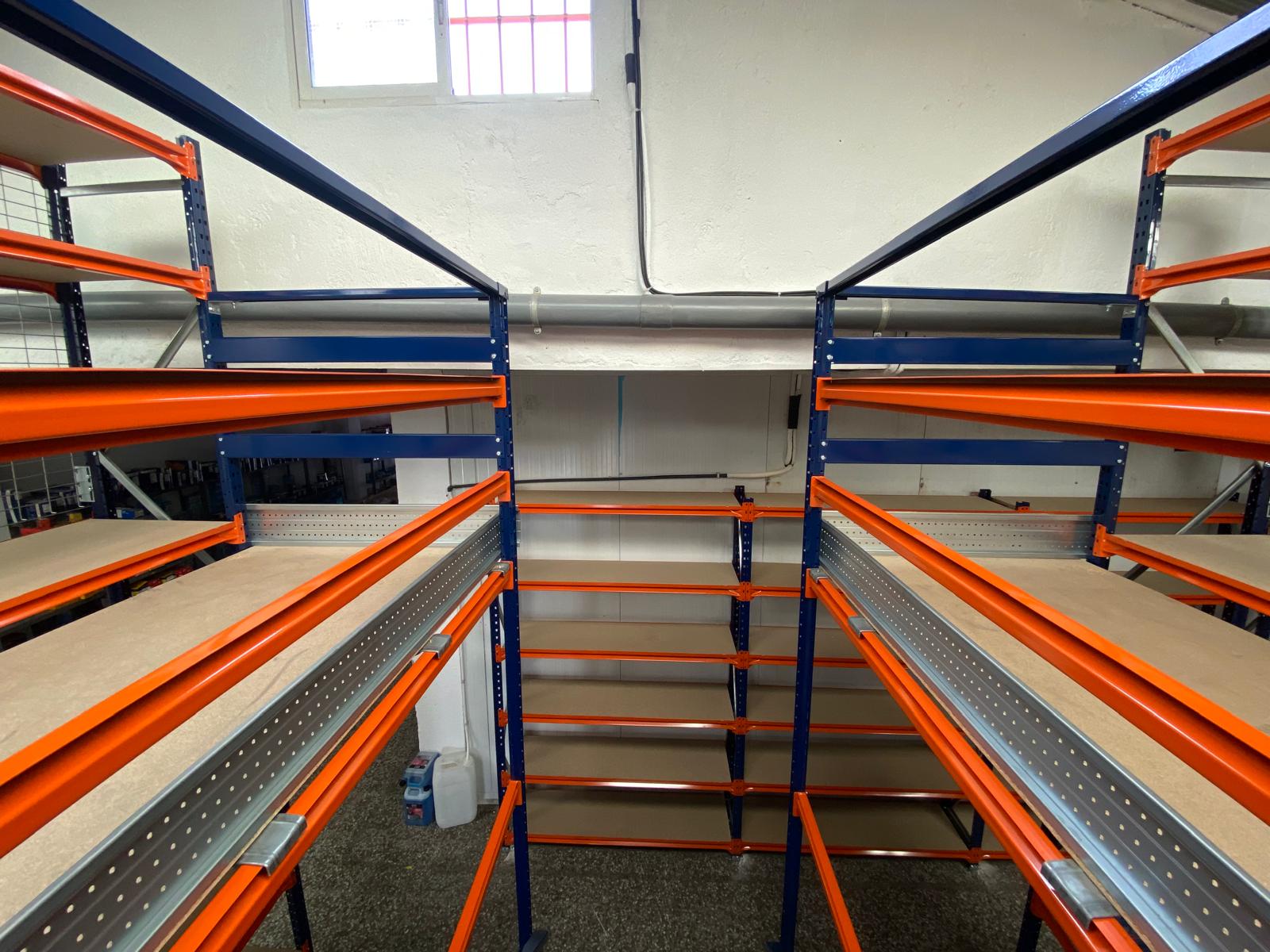 – 2 estanterías de acceso simple con 9 niveles de carga, estas se componen por 2 módulos de 1.200mm y otros 3 módulos de 1.800mm de longitud, los bastidores tienen 600mm de fondo y una altura total de 4.000mm